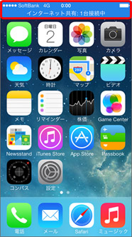 テザリング中(インターネット共有中)の表示例です(SoftBank 4G LTEエリア内で1台の機器と接続した場合)。