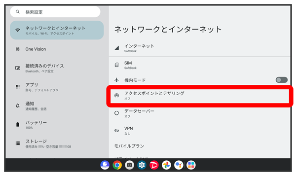 ホーム画面で「設定」→「ネットワークとインターネット」→「アクセスポイントとテザリング」をクリックします。