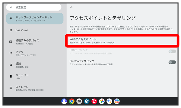 - Wi-Fi接続でのテザリングを終了する場合は、タブレットの「Wi-Fiアクセスポイントの使用」を無効にしてください。