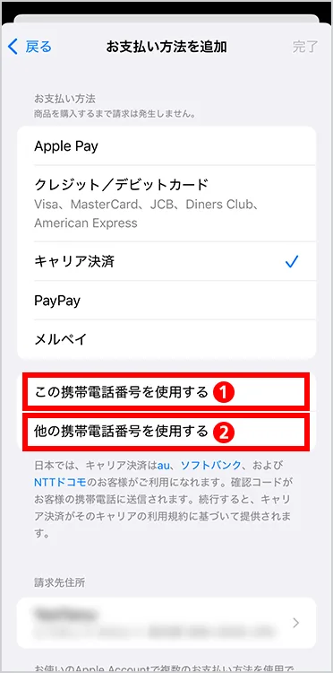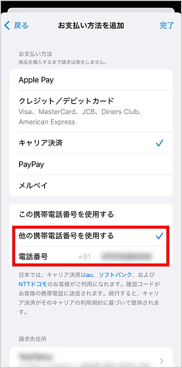 の「他の携帯電話番号を使用する」を押した場合は、その下に携帯電話番号を入力し「完了」を押します。 -