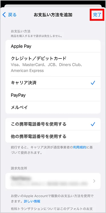 の「この携帯電話番号を使用する」を選択した場合は、「完了」を押して、設定を完了します。- Apple社の認証により、ステップ6、7の操作が必要になる場合があります。
