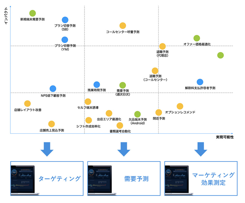 ソフトバンクでは、自社での取り組みを通じて培ったDataRobotによる分析ノウハウをパッケージ化してご提供いたします。これにより「ターゲティング」や「需要予測」、「マーケティング効果測定」といった貴社のデータを生かしたAIのビジネス利活用が可能になります。