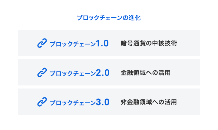 ブロックチェーンは、2008年に生まれてから約10年の間に、さまざまな技術アップデートがなされてきた。細かな定義に解釈の違いはあるが、一般的には暗号通貨のための技術だったブロックチェーン1.0から、フィンテックへの活用が可能になった2.0、そしてフィンテック領域以外への活用が可能になった現在が3.0と言われる。