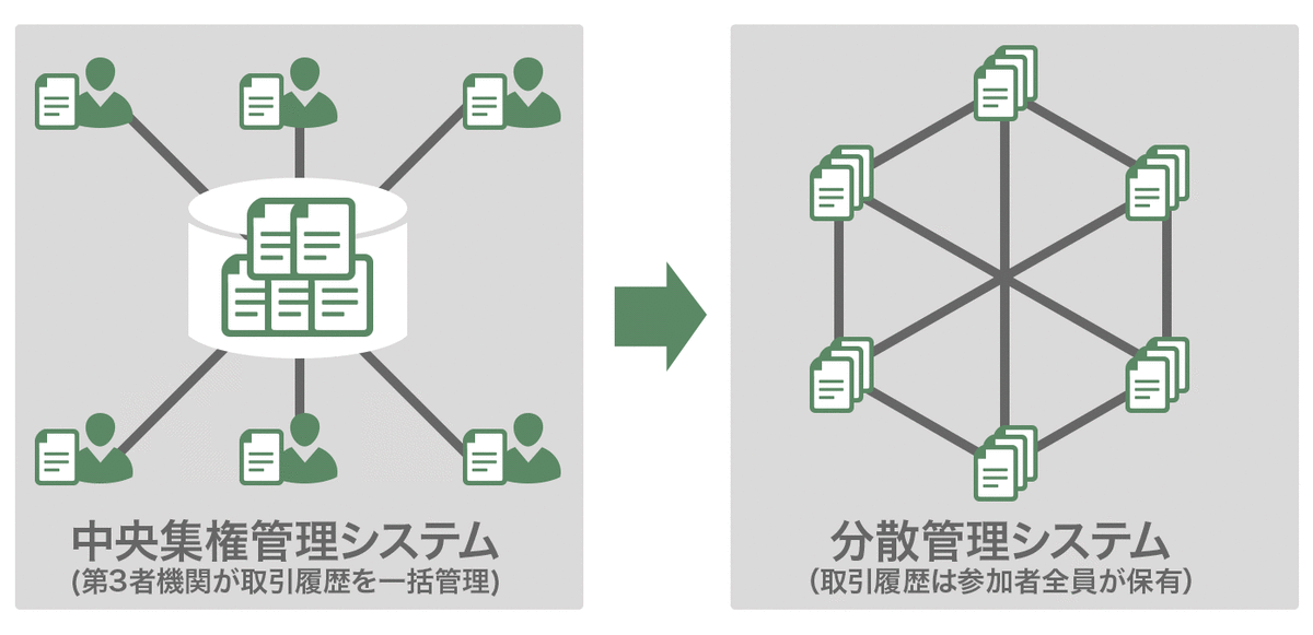ブロックチェーンは従来のクライアント・サーバー型の中央集権管理システムとは異なり、ノードと呼ばれる各端末が対等な立場で相互に通信を行うP2P(ピアツーピア)ネットワークの一種です。取引記録をまとめたブロックというデータを定期的に作成し、それらを時系列でつなげたデータをブロックチェーンと呼びます。
