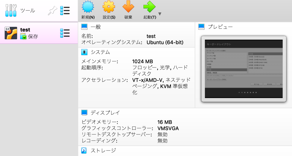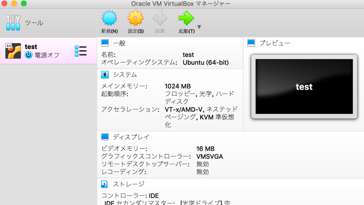 仮想マシンの作成が完了すると、左側のリストで先ほど作成した仮想マシンを選択できるようになります。選択した状態で「起動」ボタンを押します。