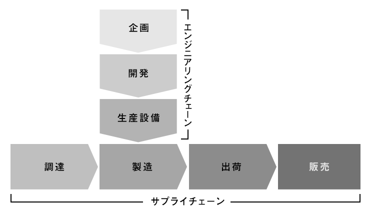 天野氏:今は製造ラインの中でのお話をしましたが、DXが広がっていくと、サプライチェーンやエンジニアリングチェーンともつながっていきます。サプライチェーンとは調達、生産、納入などの「どうやって届けるか」に関わるプロセス。エンジニアリングチェーンとは、企画、設計、生産準備といった「どのように製品を作るか」に関わるプロセスです。