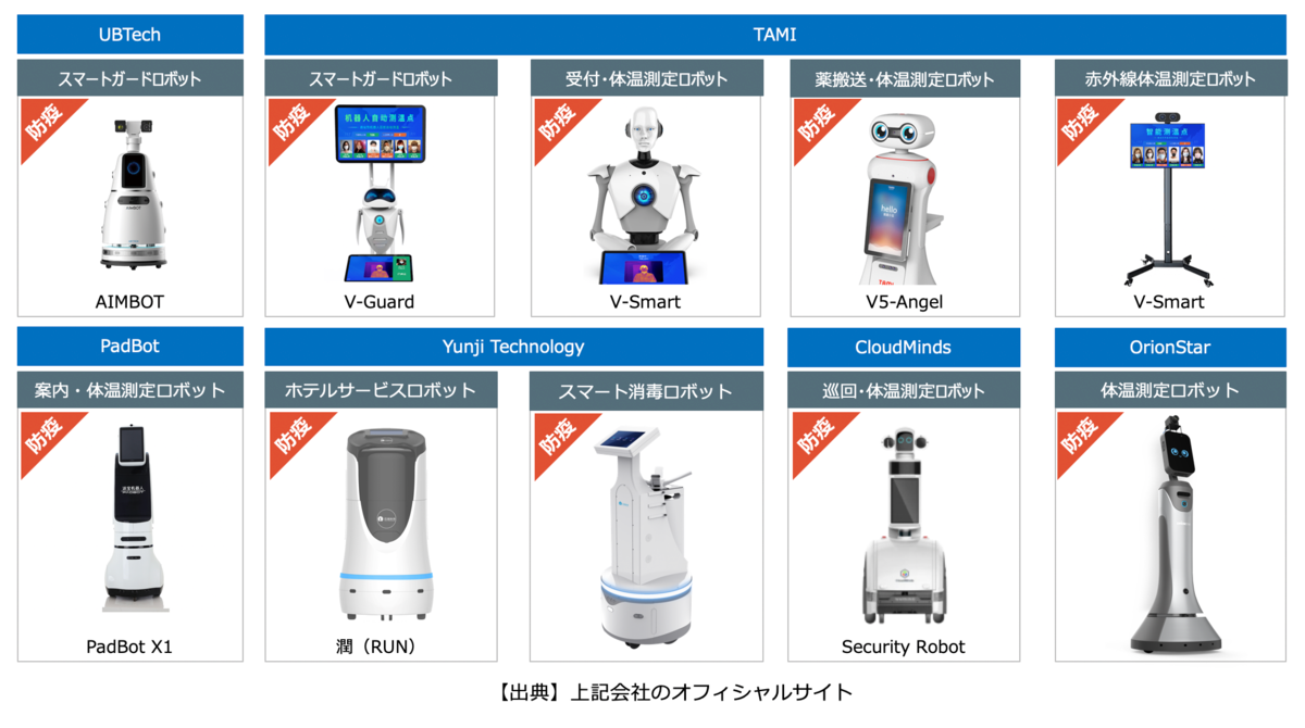 新型コロナウイルス対策の一環として、非接触型体温測定・消毒が求められています。これに対して、中国のサービスロボット専門会社は、受付・案内・搬送ロボットに体温測定や消毒などの機能を加えて防疫に生かしています。以下に、防疫ロボットの一部を紹介いたします。現在も、ショッピングモール、ホテル、レストラン、展示会、高速鉄道駅、オフィスビルなど、様々な場所で活躍しています。