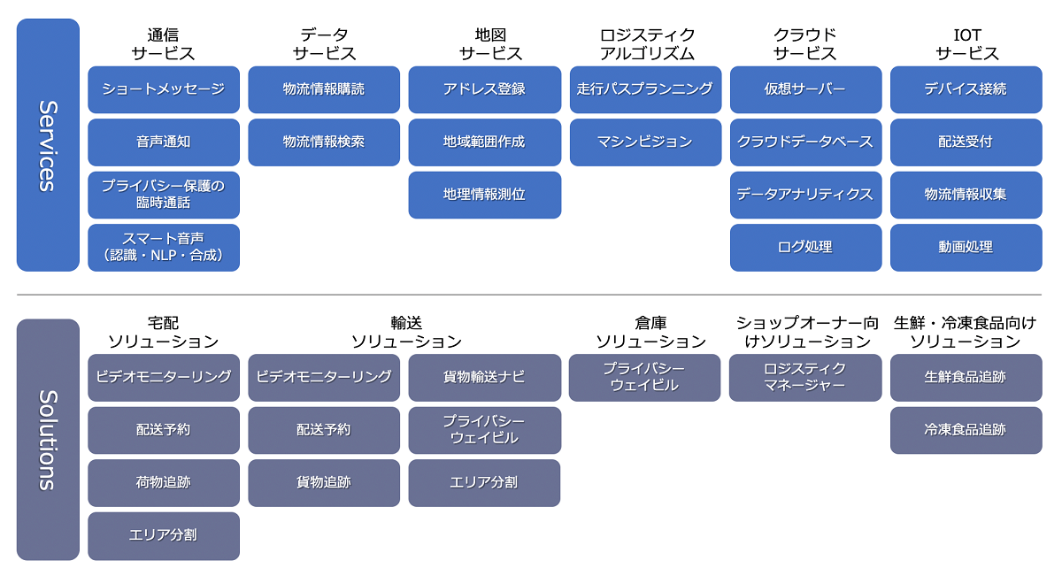 クラウドサービスの提供内容は、通信サービス・データサービス・地図サービス・ロジスティクアルゴリズム・IoTサービスなどです。ソリューションの提供内容は、宅配ソリューション・輸送ソリューション・倉庫ソリューション・ショップオーナー向けソリューション・生鮮・冷凍食品向けソリューションなどになります。