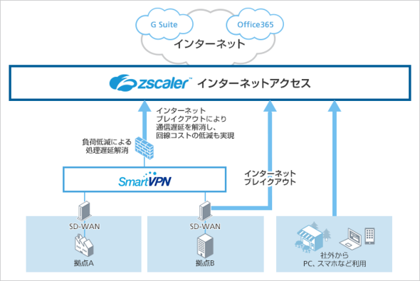 またこれまで一カ所に集中していたプロキシ機能やSSL復号機能などをクラウド側で実現することにより、ハイスペックなオンプレミスサーバや専用機器の運用、広帯域回線が不要になり、設備投資や運用コスト、IT担当者の負荷を削減できる。企業は、インターネットとの接続部分でネットワーク輻輳の考慮や、接続拠点および接続デバイスの増減に伴う煩雑な運用から解放される。