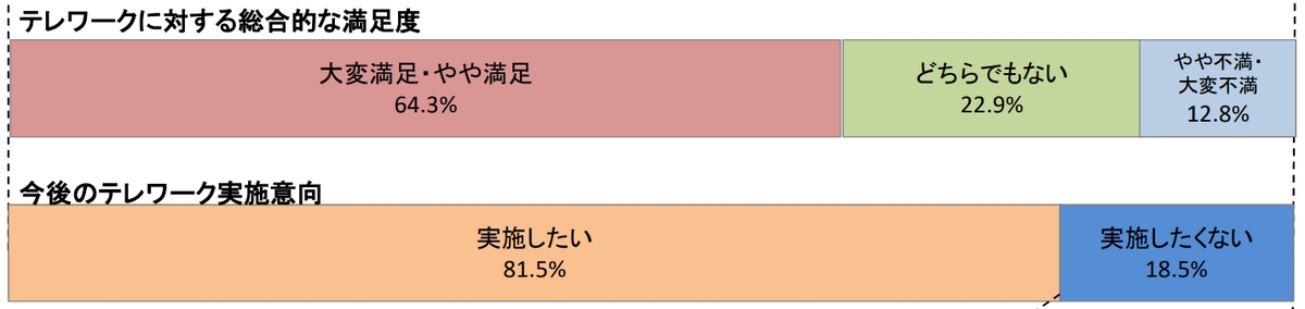 国土交通省が2021年3月に実施した調査によると、テレワークに対する総合的な満足度は「大変満足・やや満足」と64.3%が回答し、今後のテレワーク実施意向では「実施したい」と81.5%が回答しました。