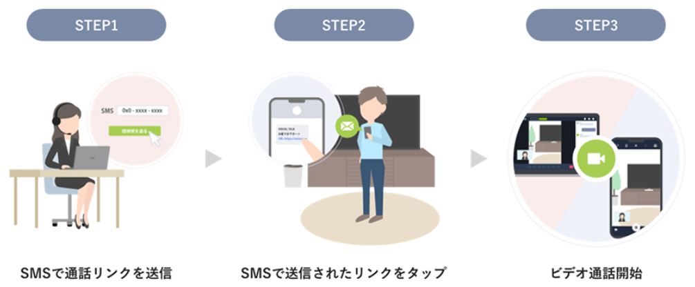 「『VISUAL TALK』は2者がスマートフォンのカメラを使い、同じ映像を見ながら遠隔でコミュニケーションできるソリューションです。映像を介して状況をリアルタイムで共有できるので直接顔をあわせなくても円滑にコミュニケーションすることが可能で、対応スピードのアップが期待できます。 使い方も簡単です。まず、コールセンターやサポートセンターのオペレータ側のPCからお客さまや社員のスマートフォンにSMSでURLを送信します。次に、お客さまや社員がURLをタップしてブラウザを立ち上げると、スマートフォンのカメラを使ってオペレータに映像を共有できるようになります」(野代)