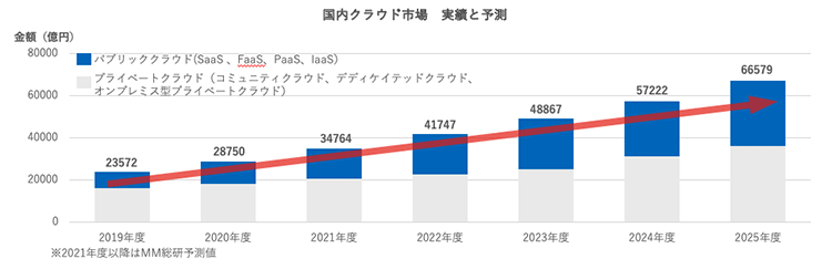 MM総研によると、2025年までのクラウド市場全体の年平均成長率(CAGR)は14.5%と予想されており、中でもパブリッククラウドの大きな成長が見込まれています。