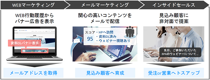 従来の対面営業では限界があることから、デジタルを活用したセールスの本格稼働に舵を切り、2018年にマーケティングとインサイドセールスを統合した新しい本部が設立されました。メール・Webコンテンツ・ウェビナーなどのデジタルマーケティングを駆使した案件創出と、電話やメールを用いて非対面で完結させるインサイドセールスの相互連携によって、対面営業ではリーチできないお客さまの獲得を目指しています。