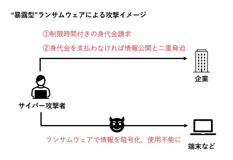 暴露型ではサイバー攻撃者は情報を暗号化した後に①制限時間内に身代金を支払わなければ情報の復元は不可能になる ②身代金を支払わなければ窃取した情報を公開する という二重の脅迫を行います。これは被害企業が金銭を支払わないことによるリスクを増大させる手口であり、被害企業はより大きな金銭面でのプレッシャーを受けることになります。