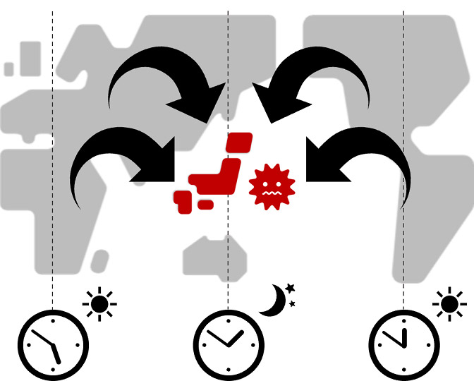 「ハッカーだって人間なのだから夜間休日は攻撃してこないのでは?」そんな考えが頭をよぎったことはありませんか。しかし、現実はそう甘くないようです。ダークネット*の通信動向をリアルタイムで分析・公開している「NICTERWEB」(国立研究開発法人 情報通信研究機構)では、サイバー攻撃の動向を昼夜を問わず観測しています。国境も時差もないサイバー攻撃の世界では、攻撃が必ず平日昼間に行われるとは限りません。