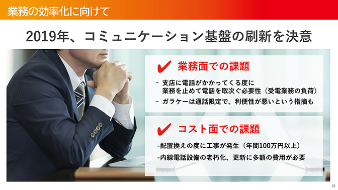 このような中で事務作業の本部集中化や障害対応を中核店へ集約させたいなどの改善すべき点があり、電話業務について抜本的に変えなければならないという認識に変わっていきました。また、レイアウト変更や人事異動のたびに電話の設定変更を行わねばならず、PBXや固定電話の 更新に約2億円 かかることが判明したことも重なり、スマートフォン導入を決意するに至ったと言います。