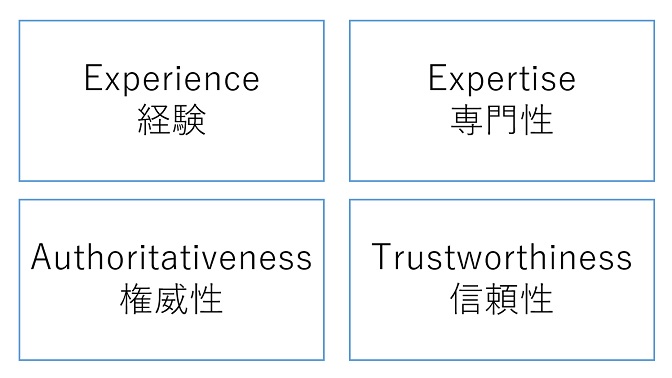 Google検索では、ページを評価する上での指標となる「4つの基準」があります。それが「EEAT」です。「EEAT」とは、「Experience(経験)」「Expertise(専門性)」「Authoritativeness(権威性)」「Trustworthiness(信頼性)」の頭文字を取ったもので、Googleの検索品質評価ガイドラインの基準となるものです。