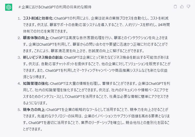 ChatGPTの機能が今後強化されれば、企業の競争力強化や新規ビジネスの創出などにも役立つようになる可能性があります。下記は現時点で質問者の役割を「経営企画担当者」と設定して、ChatGPTが将来どのような業務に役立つかについて聞いてみた際に得られた回答です。こういった予測も気軽に得ることができます。