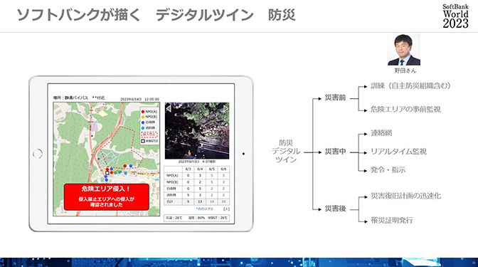 デジタルツインの構築に必要なテクノロジーを開発しているソフトバンクの常務執行役員 法人事業統括付 野田 真は、「デジタルツインは防災のほか産業インフラ、MaaS、観光などさまざまな分野で将来欠かせないツールとなる」と続けました。