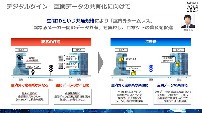 「ソフトバンクではデジタルツインの実現のために、3Dモデリングをはじめさまざまなテクノロジーを開発しており、その中の一つに政府主導で整備の検討が進んでいる『空間ID』というものがあります。日本の住所番地は日本語ベースで複雑な住所体系になっていますが、屋内外で座標系が全然違うという課題があります。そこで、一意に”この物体はどこにある”ということを誤解なく伝わるような、新たな住所データとして『空間ID』の整備を進めようとしています。これにより、自動運転社会や配送インフラの整備のサポートをしたいと考えています」