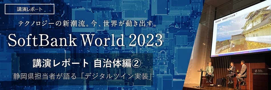 「テクノロジーの新潮流。今、世界が動きだす。」をテーマに開催された、ソフトバンクとして最大規模の法人向けイベント「SoftBank World 2023」では、デジタルツインの実装経験がある静岡県の担当者が登壇し、現場視点のリアルな実装の様子について、事例を交えながらディスカッション形式で講演を行いました。