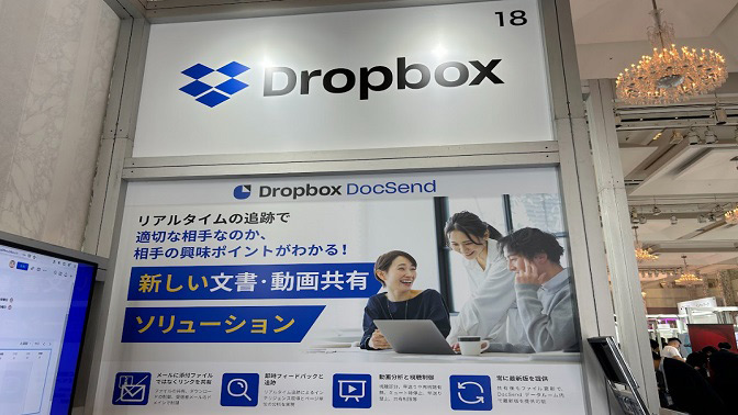 DocSendというデータのやりとりのその先を詳しく分析できる「追跡機能」が追加されました。これは、データを送ったあとユーザがどのページにどのくらいの時間費やしたのかなど分析できる機能です。さらにランサムウェア対策の機能も追加されセキュリティ面も強化されたそうです。このDocSend機能を拡販していくためにも、お客さまのニーズをしっかり把握していくそうです。「今はベンチャーや人事向けと考えていますが今後はDropboxとAIを掛け合わせて新しいものを生み出す未来を目指します」と担当者は語ってくれました。ブース内ではクイズ形式でDropboxの機能を紹介するなど、お客さまが楽しく参加していてとても賑わっていました。
