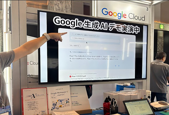 こちらのブースでは、Google Workspaceコラボレーションツールにおける生成AI「Duet AI」と、Google Cloud(GCP)クラウドの生成AIを、あらゆる企業で活用していただくためのデモが展示されていました。「Duet AI」はGmail、ドキュメント、スプレッドシート、スライドなどに組み込まれた生成AIで、Duet AIによって業務やコミュニケーションの生産性が大きく向上され、ワークフローの高速化や会議の充実など、多くの点でGoogle製品がアップデートされることを紹介していました。