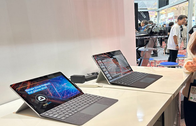 こちらのブースでは、「Microsoft 365 Copilot」の具体的な紹介と、高性能でスタイリッシュなPC(Microsoft Surface)の展示が行われており、多くの人で賑わっていました。