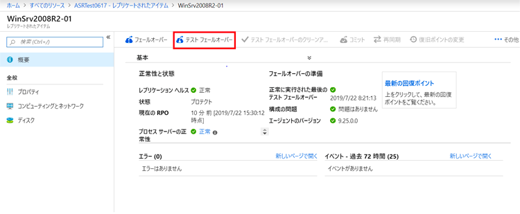 フェールオーバーの手順は、下記画面の「フェールオーバー」をクリックして、復旧ポイントを指定するだけです。本検証では、テストフェールオーバーで行いました。