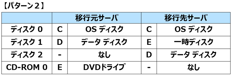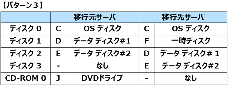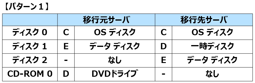 そこで、移行元サーバのディスク構成をいくつか変えて、移行先サーバのディスク構成をOS上で確認してみました。結果は以下の通りです。