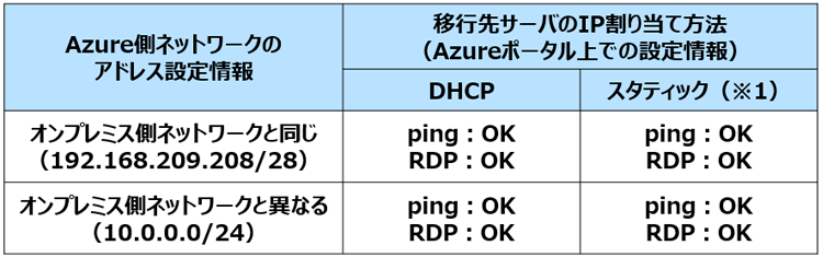 Azureへの移行にあたり、Azure側ネットワークと移行先サーバの設定を下記の4パターンで試したところ、全てのパターンでpingとリモートデスクトップ接続(RDP)ともにネットワークアクセスができました。
