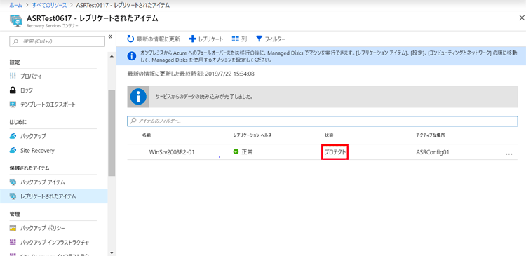 ここまで設定した後、「レプリケーションを有効にする」をクリックして、レプリケーションが完了するまで待ちます。レプリケーションが完了すると、状態が「プロテクト」になり、いつでもフェールオーバーできます。