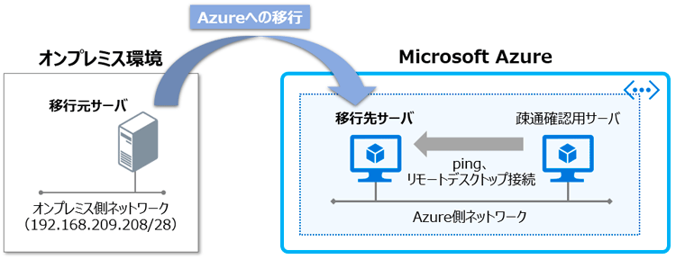 Azure上の疎通確認用サーバを使って、移行先サーバへのpingおよびリモートデスクトップ接続(RDP)を行ってみます。