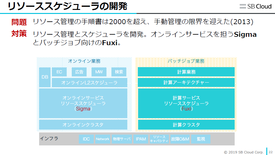 「このときはECや広告などのオンラインサービスを担うSigmaと、計算業務などを担うバッチジョブ向けのFuxiと、2種類のリソーススケジューラを開発することで解決しました」(寺尾)
