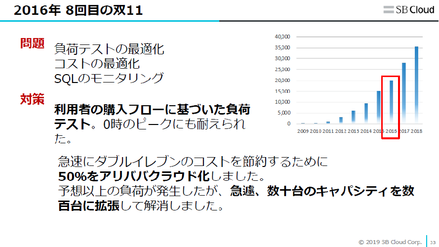 このようシステム化を繰り返して解決をしていったものの、“ダブルイレブンの驚異的な負荷を与えたら動かなくなる”という事態が発生。「そこで同年に大規模な負荷テストを何度も実施し、600以上のバグを改修しています。これにより、システムの信頼性を向上することができました」(寺尾)