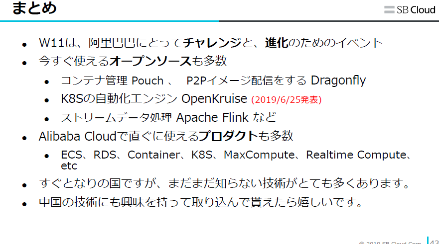 「W11はアリババにとってもチャレンジと進化のためのイベントです。その進化の過程で生まれたPouchやDragonflyはオープンソースとして利用していただくこともできますし、Alibaba CloudではECSやRDSなど、すぐに使えるプロダクトも多数用意しています。中国はすぐ隣の国ですが、知らない技術もたくさんあるので、みなさんにも興味をもって取り組んでもらえたらうれしいです」