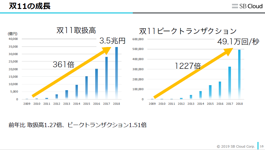 寺尾は「独身の日は“天猫でショッピングフェスティバルをやりたい”という話が社内であがったことからスタートしています。同年にAlibaba Cloudが誕生していますが、これはW11を行ううえでインフラを強化するためにつくったものだったんです」というエピソードも披露しました。