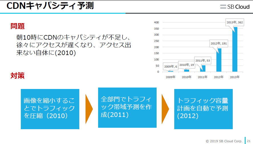 この頃は、課題を見つけてはシステム化することを繰り返していたようです。たとえば、CDNキャパシティ予測。2010年には朝10時にCDNのキャパシティが不足し、徐々にアクセスが遅くなり、最後はアクセスできない事態が発生していました。