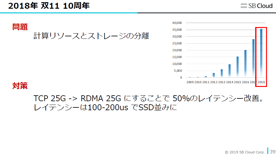 「2017年はデータベースとストレージの間をTCP 25Gのネットワークで結び、半分力業で帯域を増やしました。ストレージエンジンは独自開発の分散ストレージエンジンPangu 2.0を使ってスピードを速くしています。2018年はTCPをRDMAに変えたことで、直接、Pangu 2.0のSDKを使ってアクセスできるように改善しました。これによりレイテンシーが50%改善しました」(寺尾)