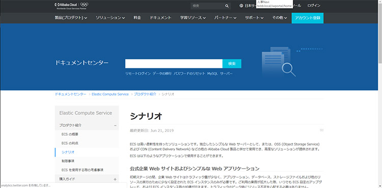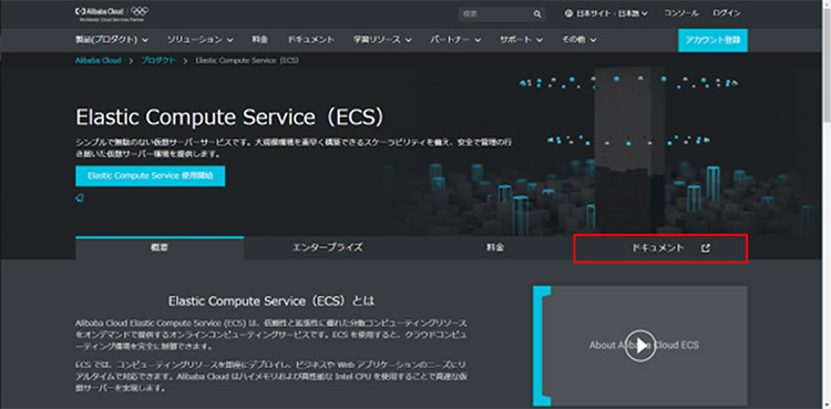 Alibaba Cloud公式サイトから製品ページ(Alibaba Cloud: クラウドコンピューティングサービス) にいくと「ドキュメント」という項目が出てきます。