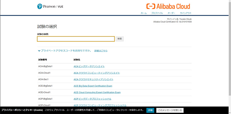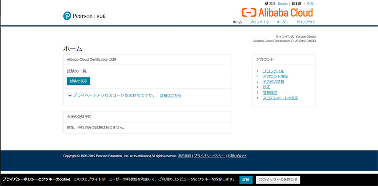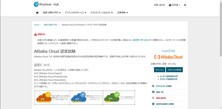 Alibaba Cloud Certificationは、ピアソンVUEから受検できます。