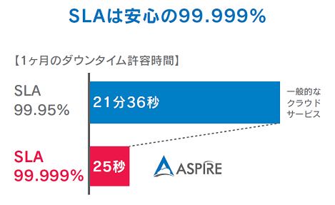 ASPIREでは SLA(Service Level Agreement)を99.999% に設定していますので、月間のダウンタイム許容時間はたったの「25秒」です。そのため業務系や基幹系などの止められないシステムでも安心してご利用いただくことができます。
