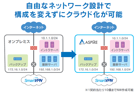 また、ASPIREでは ネットワークは1契約につき10個までお客さまで自由に作成する事ができる ため複雑なネットワーク構成であっても、そのままの構成でクラウド移行することが可能です。