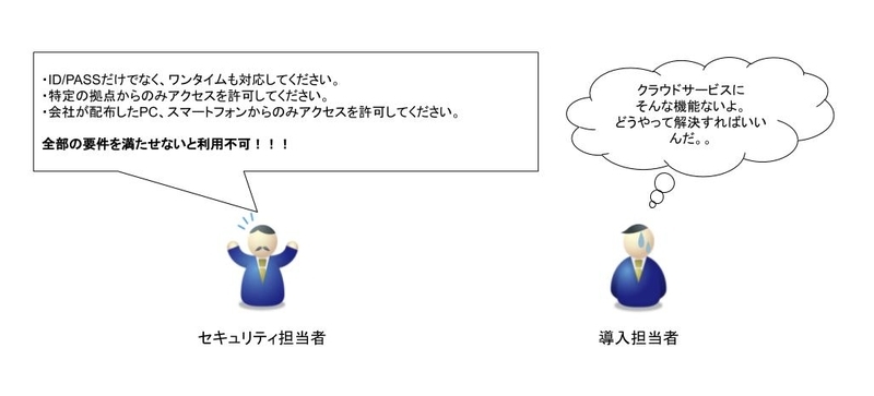 その中でも特に多いのが上記の図のようなアクセス制限に関する要件です。このような要件は、前回 ご説明したように多要素認証を行うことで解決することができますが、現実は全てのクラウドが多要素認証に対応してはいないため、クラウドサービス単体では要件を満たすことが難しい場合があります。
