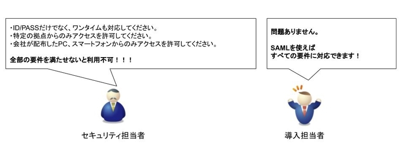 しかし、ご安心ください!そのような問題に関しても、クラウドの世界では解決方法が用意されています。それが外部の認証システムと連携する仕組み「SAML」と呼ばれるものになります。