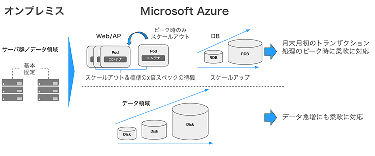 今回のマイグレーションでは、クラウド化のメリットを最大限に活かすために、フロント部分のWeb/AP層をコンテナ化(Azure Kubernetes Serviceを利用)することにより、DevOpsによる生産性の向上と俊敏性、オーケストレーターによる高可用性、環境管理の負荷軽減などを実現できるようにクラウド最適化(モダナイゼーション)を実施しました。