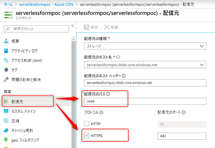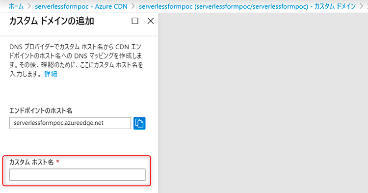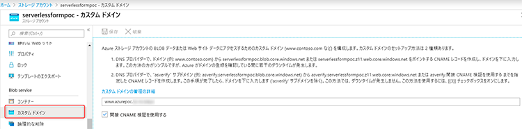 2-2でBLOBストレージコンテナーで静的サイトをホストした際には「serverlessformpoc.z11.web.core.windows.net」を登録しましが、今回はストレージコンテナー自体のFQDNである「serverlessformpoc.blob.core.windows.net」をセットすることに注意してください。