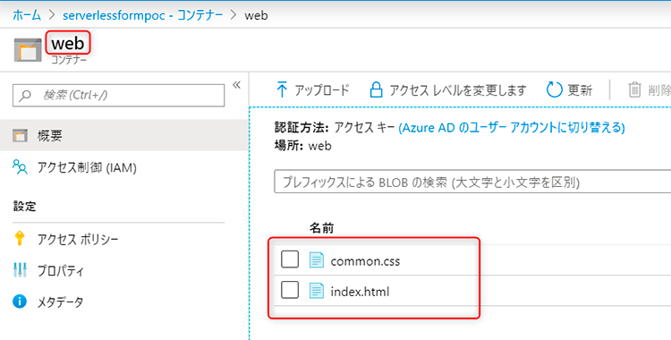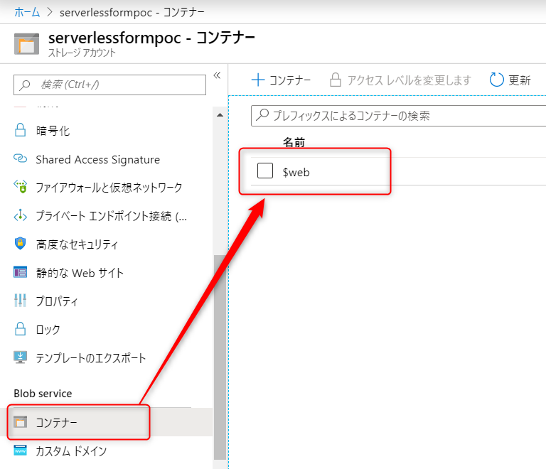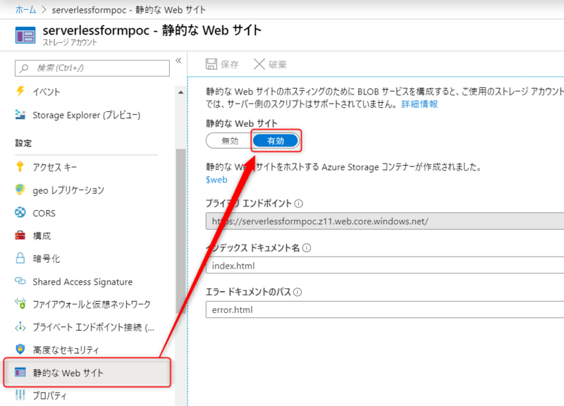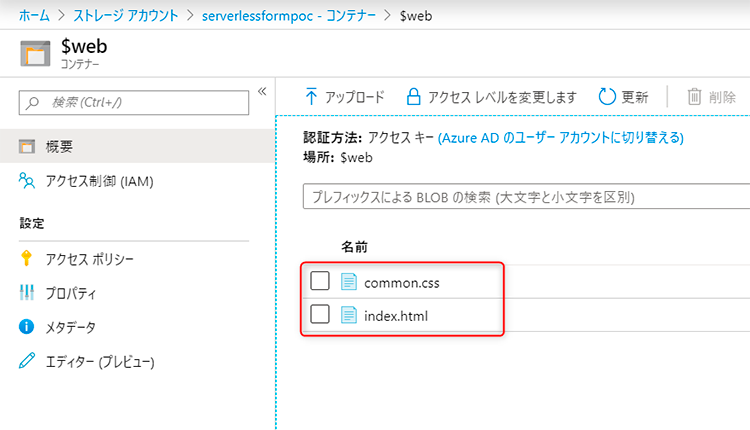 ちなみに青枠の「serverlessformpoc.blob.core.windows.net」はこのBLOBストレージ自体のFQDNです。
