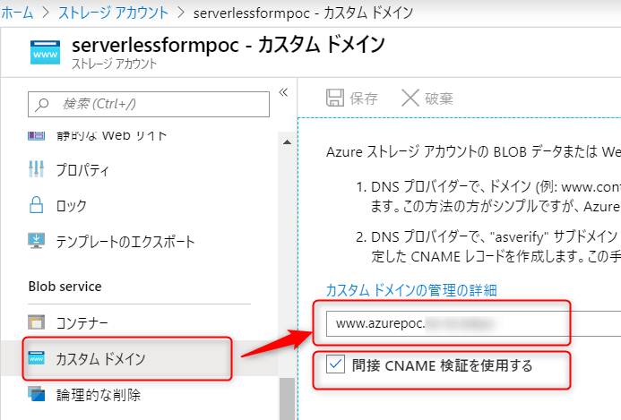 ストレージアカウント > Blob service > カスタムドメインと進みます。