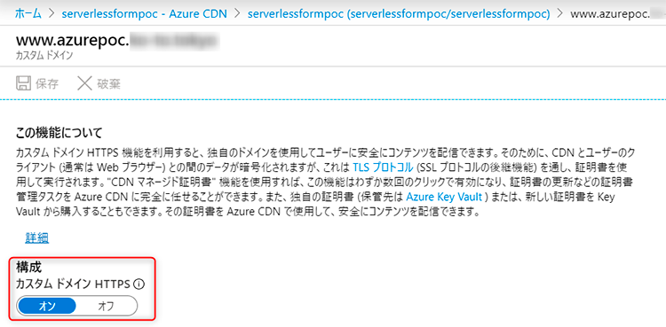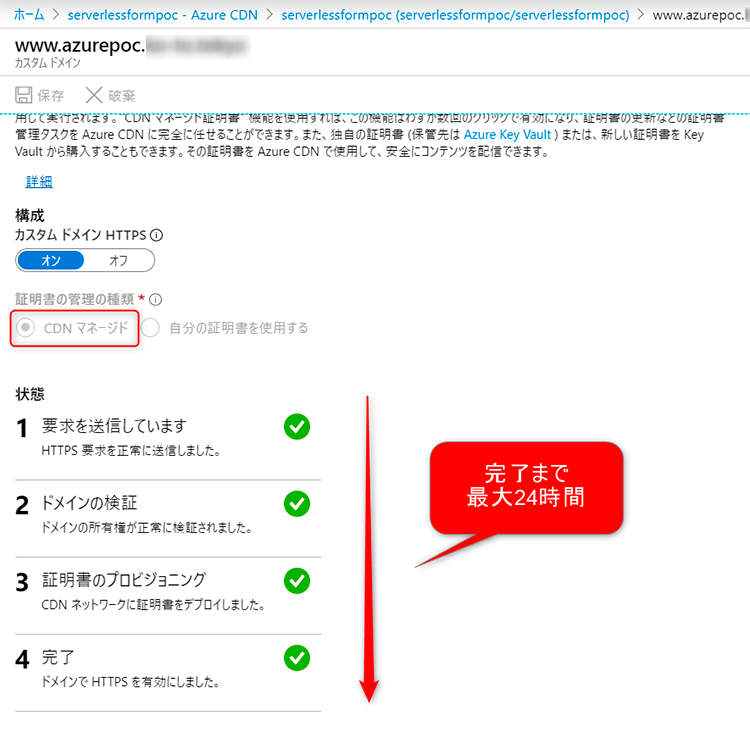 たったこれだけの手順で、AzureからDVベースのSSL証明書が発行され、CDN上にデプロイされます。